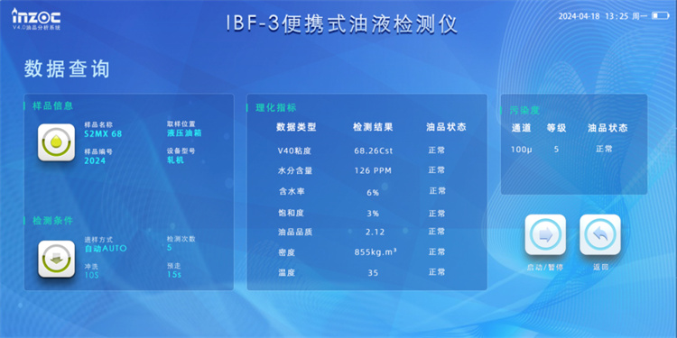 為了進(jìn)一步驗證在線監(jiān)測系統(tǒng)的可靠性,我們的技術(shù)人員采用了多項檢測方式:一,在嚴(yán)格遵循標(biāo)準(zhǔn)取樣操作流程下將樣品送檢至第三方機(jī)構(gòu)進(jìn)行專 業(yè)分析;二,利用IBF系列便攜式油品檢測儀進(jìn)行現(xiàn)場即時檢測,結(jié)果顯示污染度等級為2級。