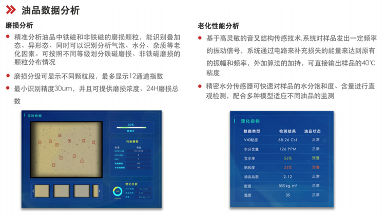 其次,儀器采用先進(jìn)的遮光法技術(shù)和算法,全方面檢測油品中各項老化指標(biāo),可進(jìn)行污染度分級、磨損分級、粘度水分等指標(biāo)快速時間數(shù)字化呈現(xiàn),獨特的設(shè)計可很好去掉油液中氣泡及水分對檢測結(jié)果的影響。