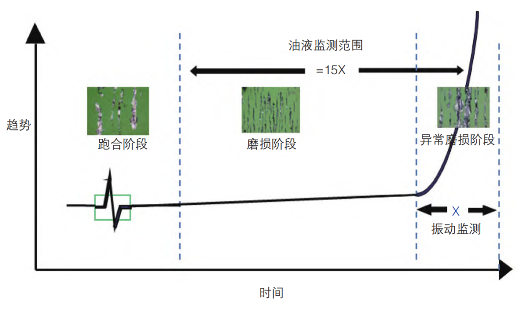 如上圖所示,“X”標(biāo)記了振動監(jiān)測傳感器發(fā)現(xiàn)設(shè)備磨損的時間點(diǎn),而油液監(jiān)測系統(tǒng)則能在該時間點(diǎn)之前約15倍的時間段內(nèi)提前預(yù)警,表明油液監(jiān)測在捕捉設(shè)備內(nèi)部早期磨損變化上更為靈敏和有 效。