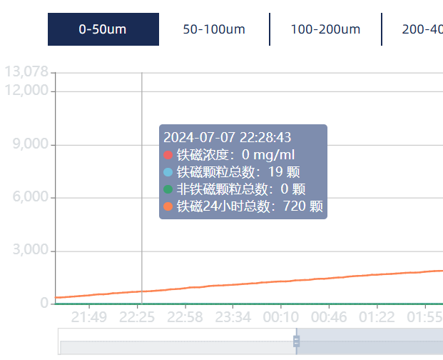 通過人機(jī)界面可以直觀查詢?nèi)?0 ℃黏度、實(shí)時黏度、油溫、水分、鐵磁顆粒、非鐵磁顆粒等數(shù)據(jù)的歷史曲線。