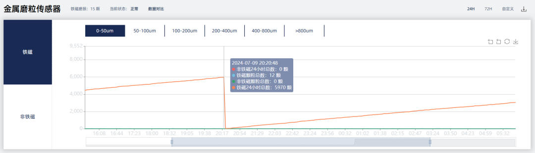 相比之下,油液在線監(jiān)測系統(tǒng)在監(jiān)測減速機(jī)內(nèi)部早期點(diǎn)蝕、磨損等失效初期狀態(tài)方面展現(xiàn)出了顯著的優(yōu)勢,這與振動監(jiān)測系統(tǒng)形成了有 效的互補(bǔ)。