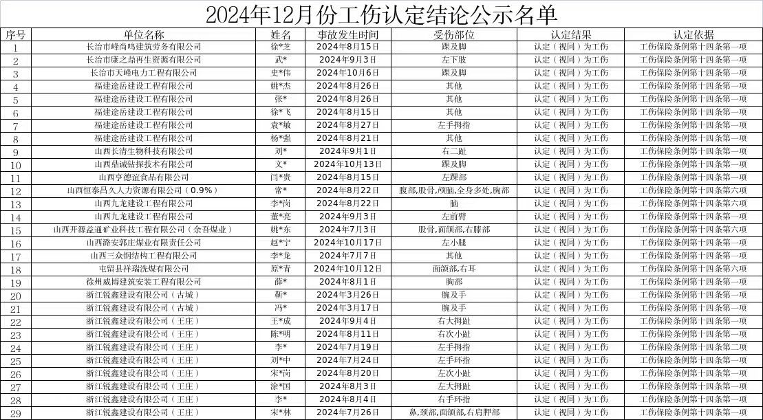 | 標(biāo)題:長治市屯留區(qū)人社局2024年12月份工傷認(rèn)定結(jié)果公示 | |
