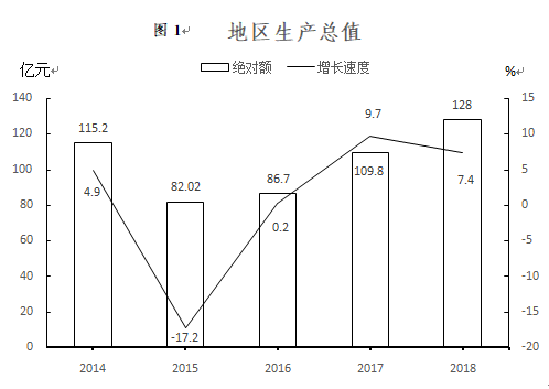 初步核算,全年全區地區生產總值1280059萬元,比上年增長7.4%。其中,第一產業增加值67325萬元,增長0.2%,占生產總值的比重為5.26%;第二產業增加值919305萬元,增長7.7%,占生產總值的比重為71.82%;第三產業增加值293429萬元,增長8.6%,占生產總值的比重為22.92%。第三產業中,交通運輸業、倉儲和郵政業增加值48631萬元,增長2.1%;批發和零售業增加值22341萬元,增長3.1%;住宿和餐飲業增加值5628萬元,增長3.5%。三次產業比例由上年的6.24:70.44:23.32調整為5.26:71.82:22.92。人均地區生產總值46824元,增長7.1%。