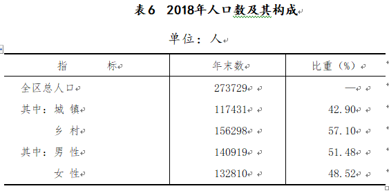 據2018年人口抽樣調查,年末全區總人口為273729人,比上年末增加710人。性別比(女=100)為106.11。城鎮化率42.9%,比上年增加1.24個百分點。全年全區出生人口2474人,人口出生率為9.05‰,死亡率為6.2‰,自然增長率為2.85‰。