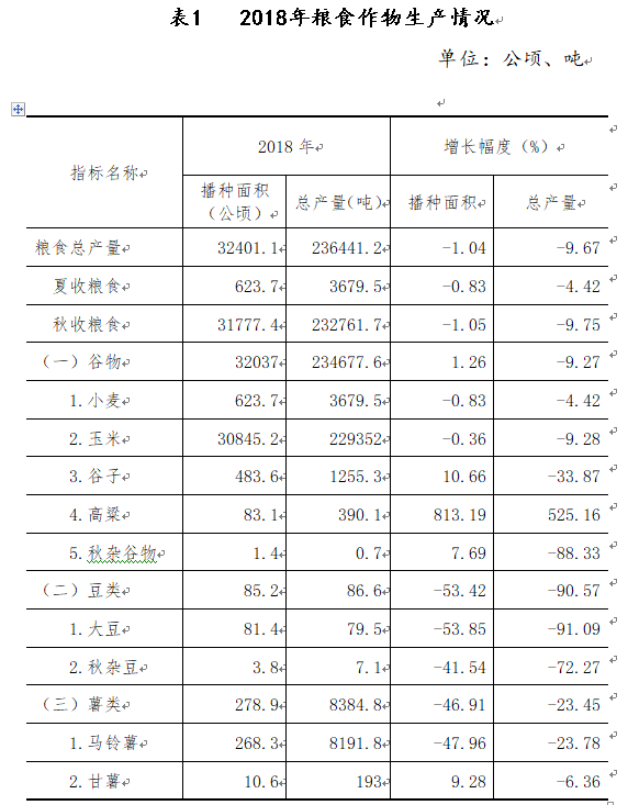 全年糧食產量236441.2噸,減產9.67%。其中,夏糧3679.5噸,減產4.42%;秋糧232761.7噸,減產9.75%;玉米產量229352噸,減產9.28%。全年蔬菜總產量91140.4噸,增產9.1%。