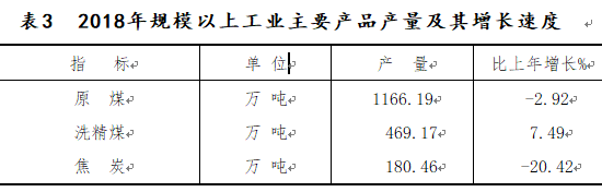 全社會原煤產量1166.19萬噸,下降2.92%;洗精煤469.17萬噸,增長7.49%;焦炭180.46萬噸,下降20.42%。