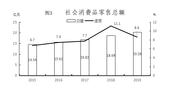 全年全區社會消費品零售總額202920.7萬元,增長8.6%。其中,城鎮消費品零售額88424.6萬元,增長8.3%;鄉村消費品零售額114496.1萬元,增長8.8%。