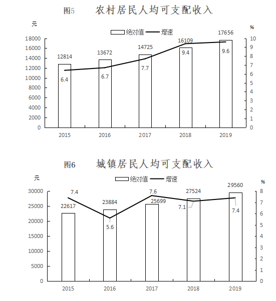 全年農村居民人均可支配收入17656元,比上年增長9.6%;城鎮居民人均可支配收入29560元,比上年增長7.4%。