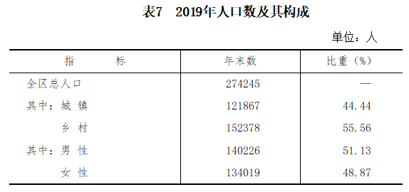 據2019年人口抽樣調查,年末全區總人口為274245人,比上年末增加516人。性別比(女=100)為104.63。城鎮化率44.44%,比上年增加1.54個百分點。全年全區出生人口2323人,人口出生率為8.48‰,死亡率為6.60‰,自然增長率為1.88‰。